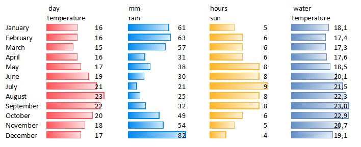 Climate The humidity in the Azores is quite high; about 75% on average, but regularly above 90%. The temperature has no extreme values, of course there are occasional outliers, of a minimum of 11°C and a maximum of 33°C, but the temperature usually varies throughout the year between an average of 15°C and 25°C. The differences between day and night are often minimal, sometimes a few degrees, so probably much less than you are used to. It rains regularly, which is good for all the greenery. Sometimes light snow can fall on the top of the volcano, but then we are talking about an altitude of 1000 m. or more. Hail does occasionally occur in winter, but sporadically. Here are some statistics: Are these temperatures disappointing? When it is sunny, the humidity often makes it feel warmer and because we are in the subtropics, the direct sunlight is stronger than in more northern regions and you can feel that. Clothing The weather can be very changeable, one moment it is sunny and suddenly there is a shower. It won't get really cold, but if the weather changes it can be a bit chilly and also if you go higher up the mountain. Therefore, always take a cardigan or sweater with you. A thin rain jacket can also come in handy. If you want to walk or hike, be sure to bring good (waterproof) shoes with sufficient profile. Flights To fly to Faial, you will always need multiple flights, but the only airline that flies to Faial is SATA / Air Azores, and depending on various circumstances, flights are unfortunately canceled regularly. We, therefore, advise you to buy all tickets as one package, even if it seems cheaper to book several separate flights. With separate flights, you are on your own if you miss your connection due to force majeure or if it is canceled. In the other case, a new flight plus any overnight stay will be arranged. You can book all flights as one trip through Azores Airlines or TAP Air Portugal, or booking agencies. It can sometimes be difficult to find a convenient connection, in that case, you may consider staying 1 or more nights in Lisbon. |